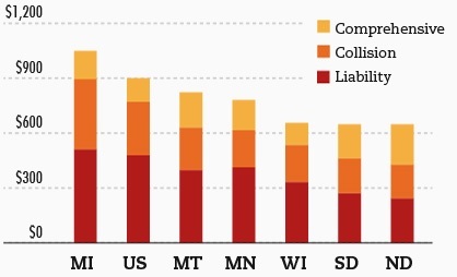 In a state like North Dakota, comprehensive coverage makes up a larger portion of the premium, along with collision and liability.