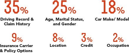 Static factors like age, marital status, and gender can contribute to 25 percent of your car insurance rates. The car make and model that you drive is another major determining factor at a whopping 18 percent. And, of course, you can’t forget your driving and claim history that impacts your car insurance rates by up to 35 percent.