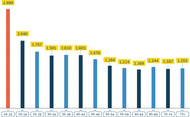 Along with age, gender plays a role in insurance costs. Young female drivers generally require fewer claims than young men, and, as a result, their insurance rates are lower.